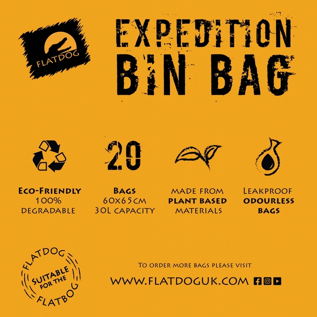 The Flatbog kit includes the Flatbog, 20 x Flatdog Expedition bin bags 5 x poo gel sachets and a convenient carry bag.